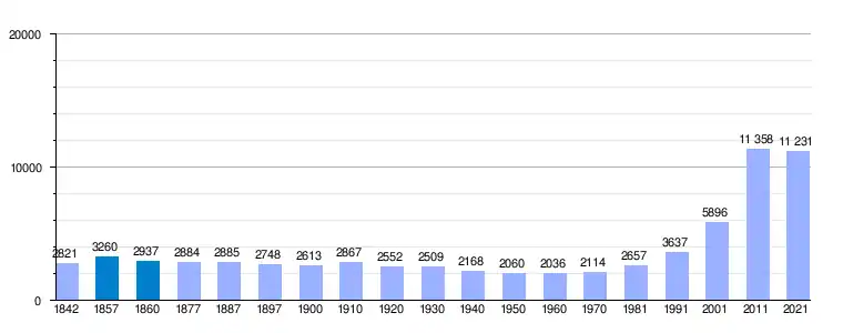 | Población | 391 (~1564) | 399 (~1596) | 1261 | 2911 | 3260 | 2856 | 2781 | 2591 | 2820 | 2506 | 2432 | 2119 | 2056 | 2009 | 2110 | 2653 | 4098 | 4830 | 6266 | 10 021 | 12 111 |