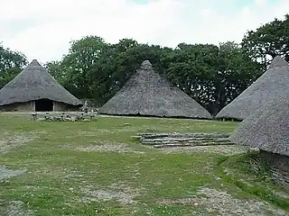 Cuatro casas circulares y un granero se han reconstruido en sus cimientos originales de la Edad del Hierro.