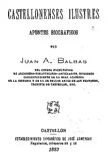- Balbás y Cruz, Juan Antonio (1883). Castellonenses ilustres. Castellón de la Plana: Establecimiento tipográfico de José Armengot. Wikidata Q115648064.