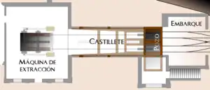 El castillete forma parte de un conjunto funcional que también engloba la casa de máquina además de otros dos cuerpos situados respectivamente al este y al sur del mismo. Espacial y visualmente forman una única construcción, aunque los materiales y volúmenes sugieren los distintos usos, todos necesarios para el cometido de la extracción del carbón del pozo vertical sobre el que se sitúan. De las distintas piezas que constituyen este conjunto, el castillete destaca por su configuración y altura sobre los demás. El edificio situado al oeste, alojó la máquina de extracción mientras que el situado más al sur contuvo otras instalaciones y a partir de un determinado momento un centro de transformación. El situado más al este era el embarque exterior del pozo.