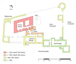 El castillo originalmente se componía de la casa del siglo XII o XIII, que fue ampliada en el siglo XV. En el siglo XVI se construyó el bloque central al sur del torreón, y se construyeron también los nuevos muros de los patios interno y externo.[3] La parte oriental del muro del patio interior está reducida a los cimientos, pero sobrevive la base de una torre redonda.[14] Al oeste, todavía sobrevive el muro del patio interior, que agrupa el antiguo patio del servicio, que contiene una cervecería y una panadería con hornos.[15] El bloque oriental fue añadido en el siglo XVII. Originalmente se accedía al castillo por el norte, pero cuando se construyó en 1890 al estación de ferrocarril, al entrada se movió al oeste.[3]