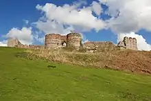 El recinto exterior era más o menos rectangular, con los muros revestidos de arenisca y rellenados de escombros, con tres metros de grosor. Las murallas, de las cuales aún quedan algunos restos, tenían algunas torres con forma de D, una innovación en los castillos ingleses de la época. Las torres permitían a los defensores disparar a través hacia adelante, pero por su diseño, con la parte posterior abierta, no ofrecían cobertura en el caso de que los atacantes lograran entrar en el interior del recinto. El recinto interior estaba situado en la cima rocosa, en el extremo oeste del risco.[7]