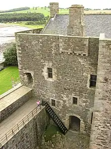 James Hamilton de Finnart, maestro de obras del rey, desarrolló entre 1534 y 1540 un programa de fortificación que incluía innovaciones tecnológicas como una compleja entrada con caponera, una de las tres que han sobrevivido en Escocia junto a las de los castillos de Stirling y Craignethan. La caponera, una galería en el muro exterior de la entrada, permitía incendiar la entrada de la fortaleza en caso de que los enemigos rompieran las defensas de la muralla. Asimismo, los muros se hicieron más gruesos, en algunos casos de 1,5 metros pasaron a 5 metros.[9]