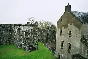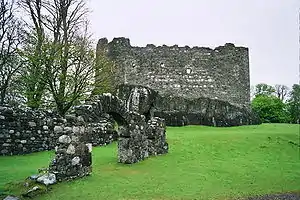 ![]() El Castillo de Dunstaffnage visto desde el este, con la casa del guarda en el centro. | ||