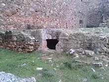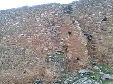 - La entrada es compleja, está formada por un gran arco de 8 m de alto y 3 m de ancho. Es de ladrillo, con un gran arco cuyas impostas sobresalen de las jambas que oculta un matacán y descansa un muro hecho de sillarejo, mampostería, ladrillo y piedra. Tras el arco hay un espacio abovedado, conocido como la cámara de la puerta.[1]