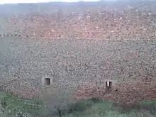 - El lado norte, está formado por dos cortinas de casi 30 m cada una, formando ángulo abierto, con altura máxima de 15 m.