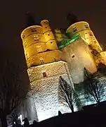 El castillo estuvo una vez dividido en dos partes alrededor de la antigua iglesia de Saint-Maimbœuf que dominaba la explanada del castillo con su alto campanario.