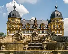 El príncipe-obispo Adam de Seinsheim construyó entre 1764 y 1771 una cascada de juegos de agua, dedicada a Neptuno, para marcar su rango. Los planos son de Johann Michael Fischer y las estatuas de Ferdinand Tietz. Un canal subterráneo de 640 m incluso está excavado, mientras que las fuentes se alimentan de diferentes fuentes. El conjunto se encontraba en un gran estado de abandono cuando el Estado de Baviera compró el castillo y los juegos de agua ya no funcionaban. La restauración duró veinte años, y la cascada se inauguró nuevamente, el 22 de julio de 1995.