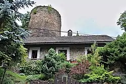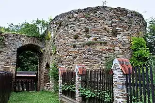 El elemento dominante del castillo era un bergfried redondo incorporado a la muralla en la esquina noreste. La entrada a la torre estaba a una altura de unos siete metros.[21] El piso superior a la entrada estaba iluminado por varias ventanas pequeñas, y el piso superior contenía aberturas estrechas regularmente espaciadas que se cree que eran aspilleras. La torre medía 930 centímetros de diámetro en la planta baja y la entrada de la planta baja se estableció en 1933.[22] En la esquina adyacente se encontraba una estructura redondeada que se cree que es una torre más pequeña. Según Tomáš Durdík, se calentaba con una estufa de azulejos,[23] pero Marek Rubeš rechazó esta hipótesis debido al reducido tamaño del interior.