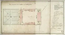 Plano general del palacio en 1768 por Johann Jakob Hill. El norte se encuentra en la zona inferior de la imagen y el sur en la superior. El esquema general del conjunto, salvo algunas excepciones concretas como el ajardinamiento del patio principal, permanece en la actualidad inalterado.