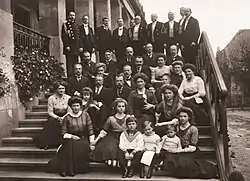 Distintos miembros de las familias del gran duque Ernesto Luis y sus hermanas Alix (casada con el zar Nicolás II de Rusia) e Irene de Hesse (casada con Enrique de Prusia, hermano de Guillermo II de Alemania) en las escaleras del pabellón principal. (Otoño de 1910)