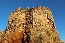 Aún pueden observarse los adarves sobre algunos lienzos de la muralla, defendidos por aspilleras y almenas apuntadas. El lienzo norte también conserva restos de matacanes o parapetos en voladizo, sostenidos por ménsulas, en un intento por proteger los puntos débiles de la fortificación.[4] Esta muralla exterior está bien conservada. Completa la defensa natural de la roca en la que se apoya, y que necesitaría una urgente consolidación, ya que en algunos tramos se está desprendiendo.[5]