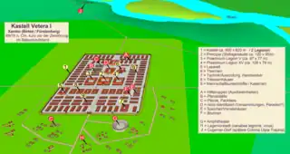 ![]() Intento de reconstrucción de Castra Vetera I (Xanten-Birten) alrededor del año 70, poco antes de la destrucción durante la rebelión de los bátavos, según publicaciones del Museo LVR de Xanten | ||