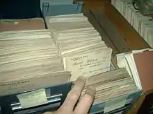 Antes de existir los catálogos en línea, las búsquedas se realizaban por medio de los ficheros catalográficos. La información de cada material se consignaba en una ficha catalográfica, la cual representaba una entrada en el catálogo de la biblioteca. Las primeras fichas utilizadas pudieron ser tomadas de los juegos de cartas franceses, que en 1700 tenían una cara en blanco.[6]