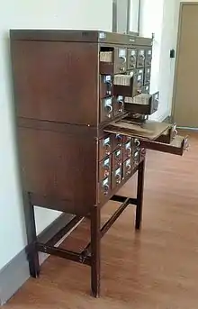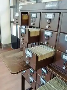 Los Catálogos de biblioteca originariamente como listas de manuscrito, se ubicaban por el formato (folio, cuarto, etc.) o en un arreglo alfabético por el autor.[3]Los catálogos impresos, a veces llamados los catálogos de diccionario permitieron al estudiante ir a una biblioteca para ganar una idea de su contenido. Estos serían interpolados a veces con las hojas en blanco en las cuales las adiciones podrían ser registradas. Los primeros catálogos de fichas aparecieron en el del siglo XIX, permitiendo mucho más flexibilidad, y hacia el final del siglo XX el OPAC fue desarrollado (véase abajo).