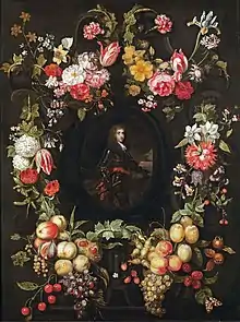 Guirnalda de flores con el retrato de un oficial de caballería.
