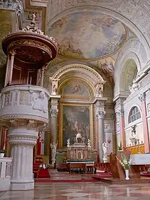 La catedral es una basílica de tres naves. En el medio entre la nave y el presbiterio hacia el este se encuentra el transepto. La cúpula de la catedral tiene una decoración lujosa y una altura de 40 metros. En coro se encuentran los dos campanarios. El portal en el pórtico oriental está diseñado como un templo griego. La entrada monumental está decorada con estatuas de santos: San Esteban, San Ladislao, y los Santos Pedro y Pablo. La fachada está soportado por columnas corintias que alcanza una altura de 17 metros.