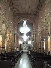 Al templo le han realizado dos intervenciones.[3] La primera de ellas consistió en cubrir el artesonado del techo con cielo raso de latón troquelado, decorado con colores locales. Luego, en 1979 a raíz de un temblor de tierra, la iglesia sufrió serias averías.[3] Por lo cual fue sometida a reparaciones que incluyeron el amarre de toda su estructura con hormigón armado, intervención que duró siete años y que la dejaron con el aspecto que hoy presenta.[3]