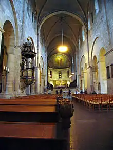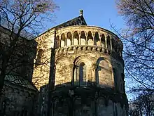 El templo fue construido en arenisca siguiendo el estilo románico de Lombardía (Italia) y de la región del Rin (Alemania). Estas influencias son evidentes en la planta, la cripta y la galería de arcos que decora la parte superior del ábside.