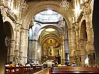 - Está formada por una planta en forma de cruz latina, con cinco naves y una gran cúpula. En la nave central su techo es de dos aguas y los laterales están cubiertos por bóvedas y seis cúpulas pequeñas.
