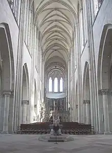 Debido a que el arzobispo Albrecht von Kefernburg había estudiado en Francia e Italia, tenía conocimiento de la nueva arquitectura gótica que se desarrollaba en Francia, pero que aún era totalmente desconocida en Alemania, lo que le llevó a construir la nueva catedral en el nuevo estilo francés. Los constructores y obreros no conocían este nuevo estilo, lo que supuso un inconveniente para su construcción, ya que tuvieron que aprenderlo de forma lenta y progresiva. La construcción del coro empezó en 1209, tan solo dos años después del incendio que arrasó la primera catedral. Por lo tanto, el coro fue construido aún en estilo románico, usando inicialmente bóvedas de arista combinadas con elementos góticos.