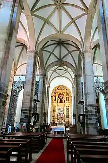 La planta es de cruz latina. Las naves son tres, de la misma altura, algo más anchas la central y el crucero. La bóvedas son de crucería y están sustentadas por pilares cruciformes rectilíneos. Las torres quedan al exterior de las naves laterales, y su espacio interior está completamente ocupado por las escaleras que llevan a la cima. Junto a las paredes de las naves laterales y del crucero se levantan algunos retablos de estilo manierista y barroco.[8]