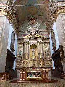 El altar del lado derecho del crucero, resguarda en el nicho central de su retablo un cuadro sobre la resurrección, encima de este una pintura que representa al cordero descrito en el Apocalipsis, y como remate del retablo del altar un Ángel. Los óvalos de este retablo enmarcan dos sendos cuadros, el primero representa la aparición de Jesús a sus discípulos en Emaús, y el segundo simboliza a San Pedro recibiendo las llaves del reino de los cielos. En la parte de abajo de estos dos óvalos, se encuentran dos relieves, uno de la aparición de Cristo a María Magdalena y otro de Santo Tomas tocando la llaga del costado de Cristo.[1]