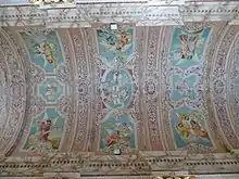 La impresionante cúpula y la nave central de templo, están decorados majestuosamente con pinturas de ángeles que sostienen las 33 jaculatorias de la Letanía del Sagrado Corazón de Jesús.[1]