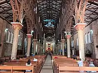 La iglesia presenta una sola planta alargada de tipo basilical con una nave central y dos laterales con varias capillas. Contiene 13 mil piezas en madera de comino crespo que sostienen la cúpula, la cual puede aproximarse al estilo románico medieval.[5] En su parte exterior presenta dos torres pequeñas laterales y un reloj en su frontis que completa la fachada.