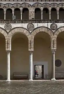 El portal de la fachada introduce a un atrio amplio -único ejemplo italiano, junto al de la Basílica de San Ambrosio- de pórtico románico cuádruple. El atrio está circundado por una columnata (que se ve como continuación hacia el exterior de las naves internas) cuyas columnas provienen del foro romano de la plaza Conforti, con arcos de medio punto decorados con piedra volcánica sobre las lesenas. Interesante resulta también la columnata sobre las bíforas y pentáforas, considerada como el inicio de la así llamada Arquitectura mediterránea.
