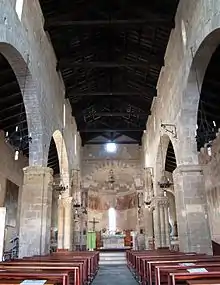 La iglesia cuenta con tres naves, donde la nave central tiene bóveda de medio cañón. Es de estilo románico-pisano con algunos elementos góticos (que datan de la última fase de construcción, en el siglo XIII), y fue construida de piedra arenisca. La fachada, los laterales, el ábside y el campanario están decorados con pilastras y bandas lombardas con numerosos motivos esculpidos, como patrones geométricos, figuras humanas y animales mitológicos.
