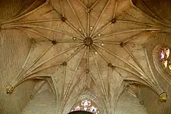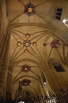 La cubierta del crucero está compuesta por una bóveda de terceletes, con sus cinco claves. Los tramos más próximos de los brazos presentan una crucería simple, barlonga, reforzada por ligadura longitudinal, y los tramos más externos, cuentan con bóvedas de crucería simple, de plan cuadrado y con ligaduras longitudinales y transversales. Los nervios presentan un perfil más agudo y complejo que los de la nave, lo que se explica por su pertenencia a una fase constructiva posterior. Otro hecho que viene a demostrar que fue construida en época posterior, es la ausencia de talla en las claves, aunque este hecho se ve disimulado, puesto que están tapadas con grandes claves postizas de madera dorada. Las bóvedas alrededor de las claves se encuentran nuevamente policromadas.