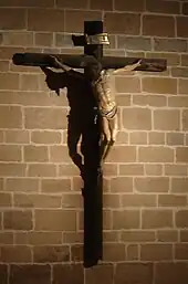 - Capilla de San Juan Bautista, que durante siglos funcionó como la parroquia del mismo nombre, vinculada completamente con la catedral y que correspondía al barrio de la Navarrería. El antiguo edificio, adyacente a la cátedra, fue absorbido por las ampliaciones góticas (1394-1501) de esta y situada en sus funciones en esta capilla; es, por tanto, la parroquia más antigua de la ciudad. Tras las expulsión de los jesuitas en 1767 estaba disponible la iglesia de Jesús y María en la calle Compañía a donde se traslada en 1951.[39][40][41]