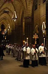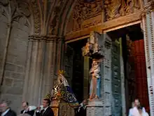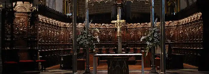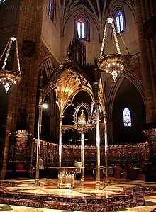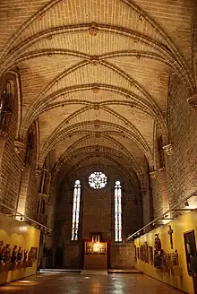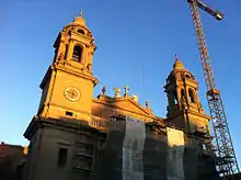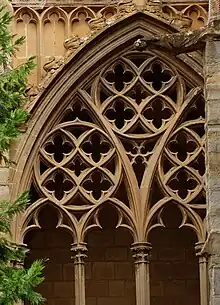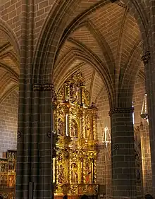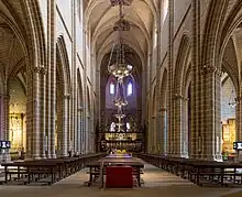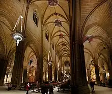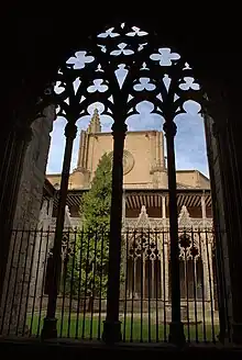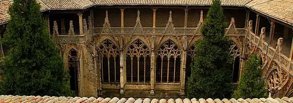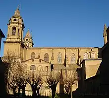 La Catedral Metropolitana de Santa María de la Asunción,[lower-alpha 1][1][2][3] situada en la ciudad de Pamplona (Comunidad Foral de Navarra, España), sede de la Archidiócesis de Pamplona y Tudela, es un conjunto arquitectónico eclesiástico único, por tratarse del complejo catedralicio más completo que se conserva en España. Presenta las edificaciones habituales en otras catedrales como iglesia, claustro y sacristías, pero además conserva la cillería, refectorio, sala capitular y dormitorio, que son más propias de la vida común a la que estaba sujeto su cabildo y que a lo largo de los siglos se han ido derribando en otras catedrales españolas.[18] Las estancias que lo configuran fueron construidas en distintas épocas y estilos, conservándose hoy en día algunas de las dependencias románicas, pero predominando sobre todo las edificadas en estilo gótico (entre ellas la iglesia y el claustro) de los siglos xiv al xvi. La fachada oeste, de estilo neoclásico, se levantó a finales del siglo xviii.[19]