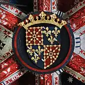 Las claves de las bóvedas y de los fajones, están decoradas con motivos heráldicos, esculpidos y policromados, y a su vez, los nervios y ligaduras llevan un pequeño escudo cerca de la clave pero únicamente policromado. Comenzando por el crucero nos encontramos con las armas de Carlos III el Noble, reina doña Blanca, Navarra-Evreux, inicial de la reina Blanca, y en el quinto tramo el escudo del obispo Martín de Peralta. El sexto tramo, al ser construido en el periodo neoclásico, no presentaba policromía ni escudo heráldico, por lo que en la última restauración (1992-1994) se hizo una recreación hipotética a partir de los ejemplos conservados en el resto de la iglesia, que sí son originales y coetáneos de la arquitectura.[lower-alpha 7] Lo más reseñable de la decoración de las claves, es que la policromía no solo se aplicó en las claves y los escudos, sino que abarca unos cuatro metros de diámetro alrededor de las mismas, estando por tanto policromada parte de la bóveda. Aunque resulte llamativo, esto era práctica habitual en la Edad Media, en la que se policromaba la piedra tanto lisa como esculpida.