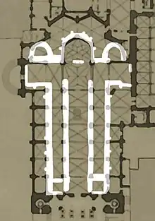 La planta de la catedral, como es habitual, está compuesta por el cuerpo de naves, el crucero y la cabecera.