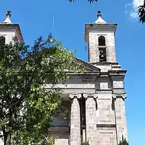 De cantera gris, sobrio y elegante. Mide más de 54 metros de altura desde su base hasta la cruz de la cúpula. Las paredes de grandes piedras, de casi un metro de ancho.Muestra en la portada un frontón de estilo neoclásico, de forma triangular, sostenido por dos columnas y pilastras que son de estilo jónico (dos a cada lado de la entrada), alcanzando los 27 metros de altura. Estas enmarcan el acceso principal al templo. cuenta con dos pequeñas torres de un solo cuerpo, de sencillas proporciones. La cúpula es de forma octagonal y cuenta con una pequeña linternilla.