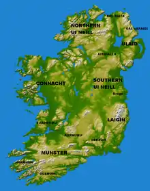 El trono Eóganachta, que tenía su sede principal en Cashel y su iglesia en Emly, era el más poderoso de la mitad del sur de Irlanda, mientras varias ramas de Uí Néill y Connachta dominaban el norte. En este tiempo los Uí Néill se disputaban el trono de Tara, con la sucesión generalmente alternando entre las ramas del norte y del sur, pese a que no mucho tiempo antes el título ceremonial de rey había sido disfrutado por Laigin y Ulaid, y más atrás, por Dáirine y Érainn.[4] El reinado de Cashel, según antiguas fuentes de Munster, p. ej. el Uraicecht Becc, había sido fundado a mediados del siglo V por los descendientes de Conall Corc y Aimend, el "círculo interior" de los Eóganachta, que después de siglo y un medio de hábiles maniobras políticas, habían llegado a desbancar a los Corcu Loígde en Munster.[5]