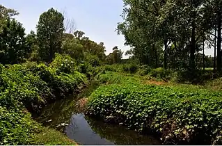 Por algún motivo el cauce viejo se dejó sin rellenar, por lo que todavía conserva parte de los meandros naturales del curso original.