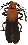 Es un escarabajo con un cuerpo delgado, aplanado dorsoventralmente y débilmente esclerotizado, de unos 7,2 mm de largo. El pronoto y la mitad basal de los Élitros son de color rojo anaranjado, mientras que el resto del cuerpo es de color marrón oscuro o negro. El pronoto y el tegumento están cubiertos de pelo anaranjado. Las antenas de la hembra son muy dentadas, mientras que las del macho tienen antenas cortas y laminares. La cabeza es pequeña y está equipada con ojos compuestos hemisféricos con diámetros iguales a 0,87 de su separación. El pronoto es 1,35 veces más ancho que el largo y plano. Tiene bordes laterales elevados y convexos y ángulos traseros agudos. Una quilla longitudinal atraviesa el centro del tercio frontal del pronoto, luego se divide para formar costillas que bordean la areola central, que llega al borde basal del pronoto. Las cubiertas tienen cuatro nervaduras longitudinales primarias bien desarrolladas y cinco nervaduras longitudinales secundarias menos desarrolladas. Entre estas nervaduras hay ranuras transversales densamente espaciadas que dividen la superficie de las cubiertas en células (aréolas).[1]