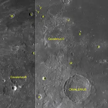 Por convención estos elementos son identificados en los mapas lunares poniendo la letra en el lado del punto medio del cráter que está más cerca de Cavalerius.