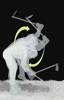 La actividad humana de cavar es un trabajo que puede destinarse a cualquier fin, como el dragado y la construcción (hoyos, zanjas, pozos, túneles, acequias, canales); pero el que describe el Diccionario de la Lengua parece referirse sobre todo a la faena agrícola, a tenor de las herramientas especificadas: "levantar y mover la tierra con la azada, el azadón u otro instrumento semejante."[4] Las expresiones coloquiales "doblar el lomo" o "doblar el espinazo" identifican la postura necesaria para cavar como el trabajo esforzado por antonomasia, vinculándolo incluso con la condición "humilde" de quien lo hace, por "humillarse" acercándose a la tierra (humus en latín).[5]