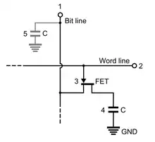 - La celda de una memoria dinámica de acceso aleatorio (DRAM).[6]