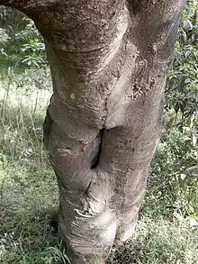 Crece a una altura de 40 metros de alto y 90 cm de ancho. El tronco es mayormente cilíndrico y algo ensanchado en la base. La corteza es delgada, café y lisa, con líneas pustulares verticales.