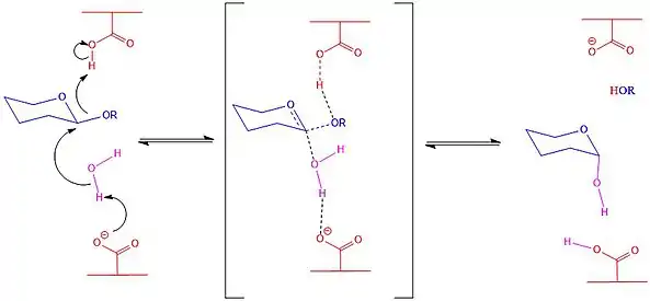 El mecanismo de retención de la configuración[17] sucede en dos etapas, en la primera, el aminoácido básico realiza un ataque nucleofílico al carbono anomérico, rompiendo el enlace glucosídico y generando un nuevo enlace con la enzima y una inversión temporal de la configuración. El monosacárido desplazado en forma de alcóxido desprotona al aminoácido protonado y se retira de la reacción. El aminoácido desprotonado ahora funciona como una base que desprotona una molécula de agua, la cual ataca al carbono anomérico rompiendo el enlace formado con la enzima y retornando la configuración anomérica original, así como regresando la enzima exactamente a como se encontraba al inicio de la reacción.