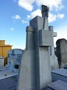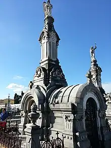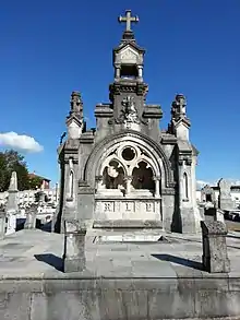 Este es el monumento más espectacular de todo el cementerio. La cripta y el proyecto fueron diseñados por Armando Fernández Cueto, artista avilesino que diseñó otros edificios en nuestra villa, como el del “Gran Hotel” (con perspectivas de balneario). Como escultor intervino otro artista muy importante, Cipriano Folgueras Doiztúa, autor de otras obras en Asturias, como la estatua de Fernando de Valdés Salas, fundador de la Universidad de Oviedo y que se encuentra en el patio central del Edificio Histórico de la misma. El monumento funerario se construyó en el año 1902 y es de mármol de Carrara. Tiene una gran arca cineraria realizada con un solo bloque de mármol con el escudo de armas familiar en el frente, todo ello sustentado por unas garras de león representando así la fuerza, robustez y poder. La figura que está sentada en esta arca es un ángel anunciador de la muerte, sabemos que es así porque tiene en su mano un trompeta. Su rostro es inquietante, con cavidades en los ojos donde la familia puso piedras preciosas pero que fueron robadas en la Guerra Civil Española. La figura posee un cuerpo femenino, pero el rostro está masculinizado, contribuyendo a presagiar un incierto destino. El arca está cubierta por un paño cuyos pliegues dejan adivinar la existencia de una cruz.