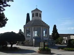 El recinto del cementerio es cuadrangular, y en el centro destaca una capilla de planta octogonal, construida en 1958 por Ramon Tèrmens Mauri.[2] Tiene todos sus lados acristalados, y está rematada por una linterna también octogonal. Cerca de la capilla se encuentra una alta torre-campanario, de 25 m altura, construida en 1956 igualmente por Ramon Tèrmens Mauri. Tiene forma de monolito, situado sobre una plataforma escalonada de planta octogonal, y es de hormigón armado con revestimiento de cantos rodados.[5]