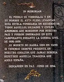 La memoria de la Guerra Civil Española y su vinculación con el Cementerio Municipal de Torrebaja ha estado siempre presente en la memoria ciudadana, prueba de ello fue una estela funeraria «In Memoriam» levantada por el Ayuntamiento Pleno en 1994, recordando a los difuntos inhumados en este cementerio durante la contienda, y un monumento donde estuvo la antigua fosa común. Frente al lugar de la escultura hay una emotiva inscripción: «EN MEMORIA DE LOS QUE YACEN AQUÍ/ Y DE TODAS LAS VÍCTIMAS DE LA GUERRA CIVIL ESPAÑOLA./ PAZ, PIEDAD, PERDÓN». Como es sabido, las tres últimas palabras de esta frase las dijo el que fuera Presidente de la II República Manuel Azaña (1880-1940) en su célebre discurso “de las tres P”: pronunciado por el estadista el 18 de julio de 1938 desde el balcón del Ayuntamiento de Barcelona.