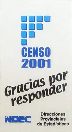 El Censo Nacional de Población, Hogares y Viviendas del año 2001 de la República Argentina se llevó a cabo entre los días sábado 17 y domingo 18 de noviembre de Censo argentino de 2001. Tal cual es la tradición en dicho país, se trató de un censo de facto o de hecho, que consiste en censar a las personas presentes en la vivienda, en el momento del censo, incluyendo a los que no residen habitualmente en el hogar, pero que "pasaron la noche" allí.