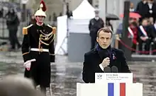 El programa oficial del centenario fue presentado durante una conferencia de prensa del Gobierno francés el 18 de septiembre de 2018. Los sucesos incluyeron una ceremonia en el Arco de Triunfo de París y un foro de paz internacional presido por el presidente de la República Emmanuel Macron.[1] El 4 de noviembre de 2018, acompañado de su esposa Brigitte Macron, recibió al presidente alemán Frank-Walter Steinmeier en la catedral de Estrasburgo para una conmemoración significando el inicio oficial del programa francés para el centenario. En sus presencias se celebró un concierto y se izaron las banderas de Francia, de Alemania y de la Unión Europea.[2][3]
